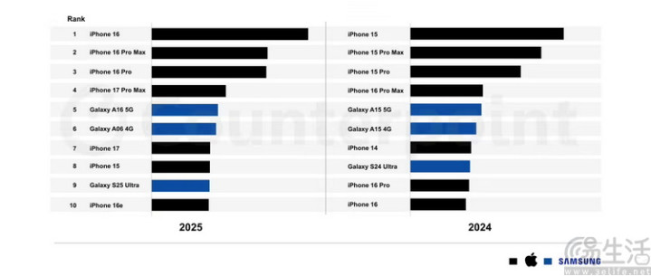 2025年和2024年全球出货量前十的手机型号