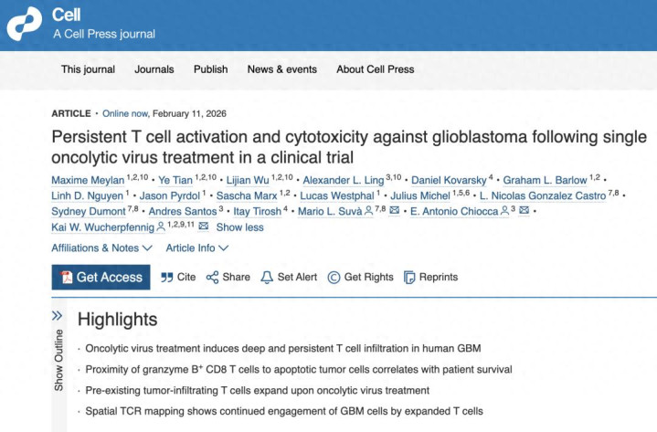 Meylan M, Tian Y, Wu L, Ling AL, Kovarsky D, Barlow GL, Nguyen LD, Pyrdol J, Marx S, Westphal L, Michel J, Gonzalez Castro LN, Dumont S, Santos A, Tirosh I, Suvà ML, Chiocca EA, Wucherpfennig KW. Persistent T cell activation and cytotoxicity against glioblastoma following single oncolytic virus treatment in a clinical trial. Cell. 2026 Feb 11:S0092-8674(25)01504-1. doi: 10.1016/j.cell.2025.12.055. Epub ahead of print. PMID: 41679299.