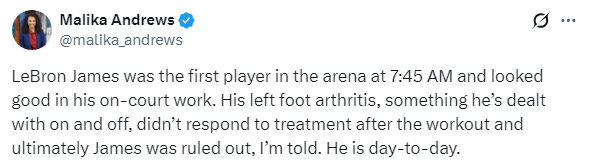 nba下注官网 揭秘詹姆斯伤停内幕! 第一个抵达球馆 邻接缺阵更多是因脚伤而非肘伤