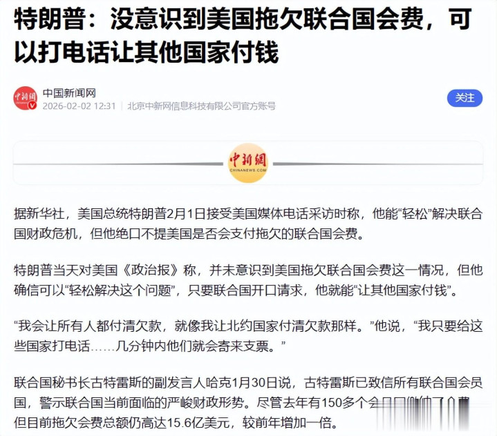 缴纳会费是美国作为联合国会员国的基本责任,不是它用来推卸责任、施压其他国家的工具,特朗普的种种表态,本质上都是在逃避责任,没有任何实质性的行动,只会让联合国的财政困局雪上加霜。