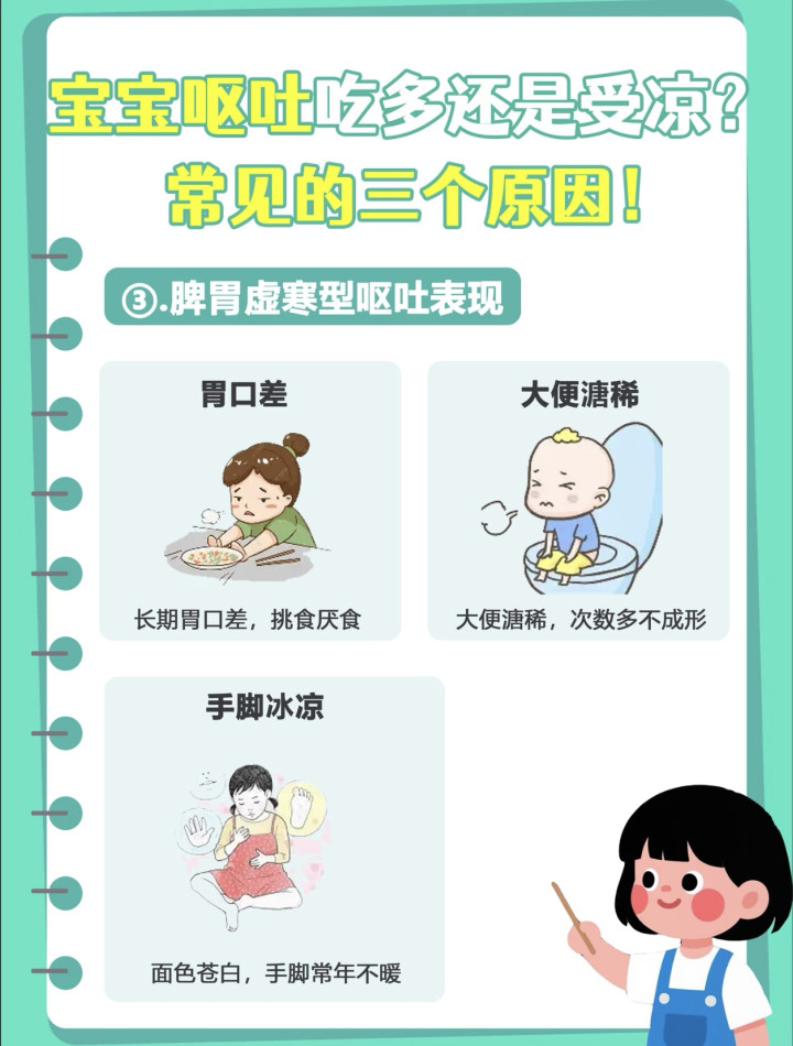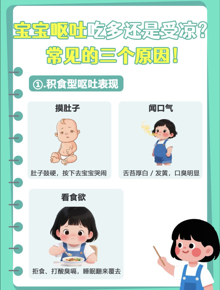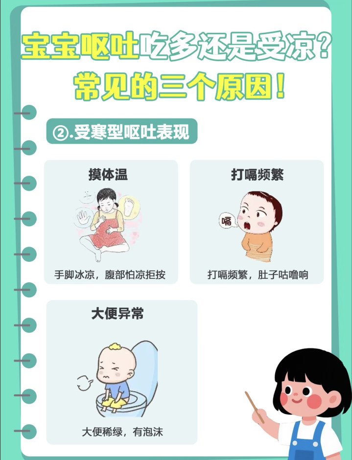 布置受寒型吐逆,中枢是“驱寒”。审视御寒,尤其是腹部;可喝点温热姜糖水(小宝宝需稀释);幸免生冷食品,饮食清淡易消化。
