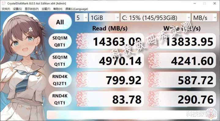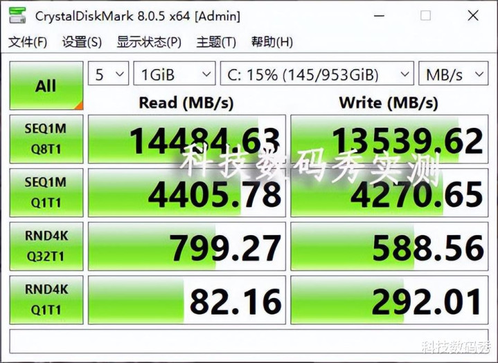 通过业内常用测速工具CrystalDiskMark测试,铠侠VE10的读取速度高达14484MB/s,写入速度高达13539MB/s,几乎和官方标称值没有太大的差距,属实相当强悍,相比PCIe4.0时代的7000MB/s读写,速度简直又翻了一倍!